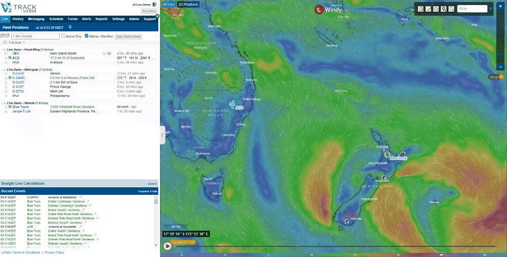 The details of bookings loaded into the schedule are fed into the flight details, as they occur.  One common application of this would be setting a pilot/driver/operator name and route of the flight/trip/voyage.  If you load these details into the v2track Schedule booking in advance of a trip, when the aircraft takes off, ship sails out, or vehicle starts up, the v2track platform will apply these details to the trip, increasing the available detail in the trip history and reports. The route is used to plot and calculate ETA’s. Users can select between a range of horizontal and vertical layouts depending on whether they have a small or a larger fleet.